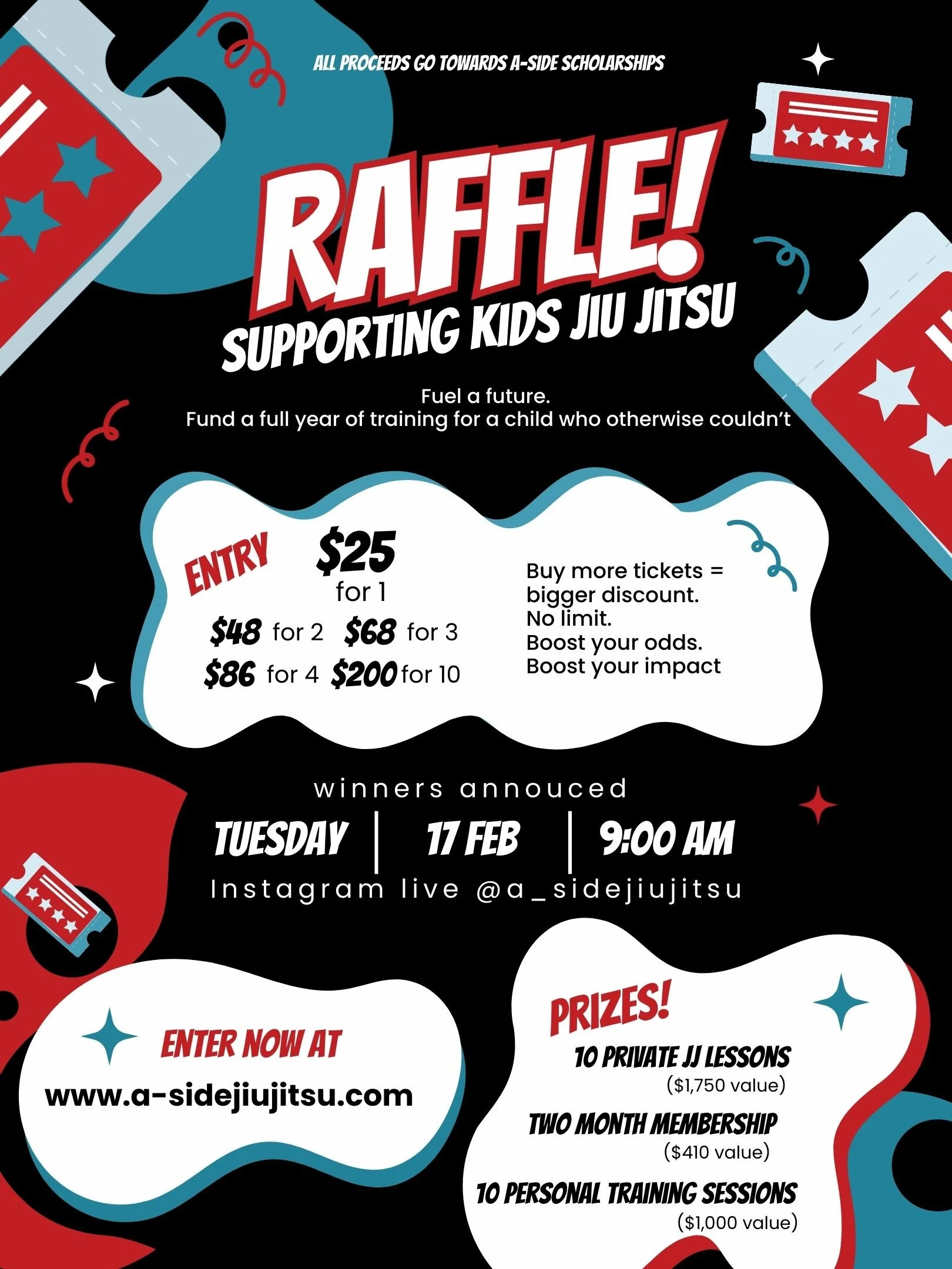 RAFFLE WINNERS: Winners will be announced on Instagram Live on our page a_sidejiujitsu on Tuesday, Feb 17 at 9:00AM. Winners do not have to be on IG Live to redeem their prizes. If you win we will reach out via email.